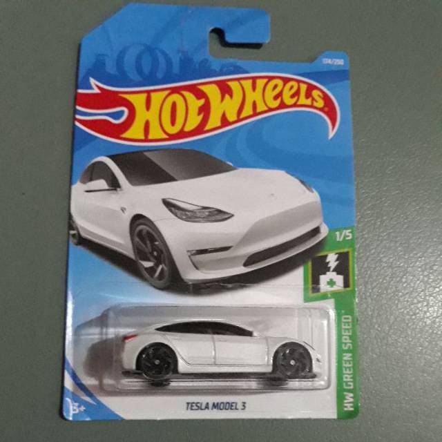 Tesla Model 3 Hot Wheels. From the back of the 2019 card: Hot wheels has released its toy version of the model 3 as part of its hw green speed collection.